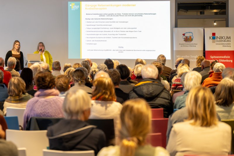 Die Expertise der onkologischen Fachpflege brachten Gabriele Bohmann-Kemper und Friederike Niemann vom Pius-Hospital sowie Kirsten Makiewicz vom Klinikum ein. Sie erklärten den Besucherinnen und Besuchern, welche Nebenwirkungen neue Therapieformen verursachen können – und welche Möglichkeiten Patientinnen und Patienten selbst haben, den Verlauf ihrer Behandlung positiv zu beeinflussen.