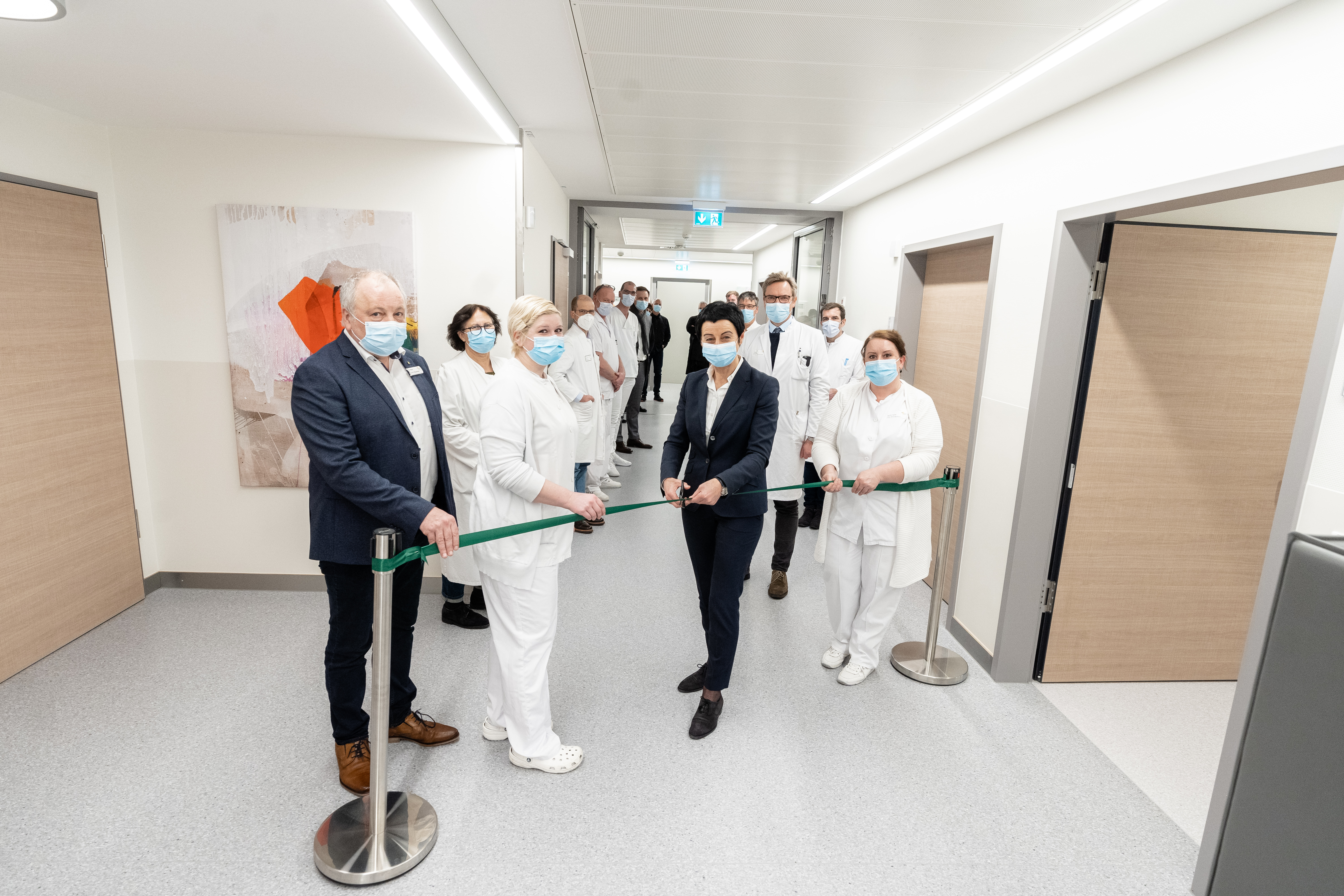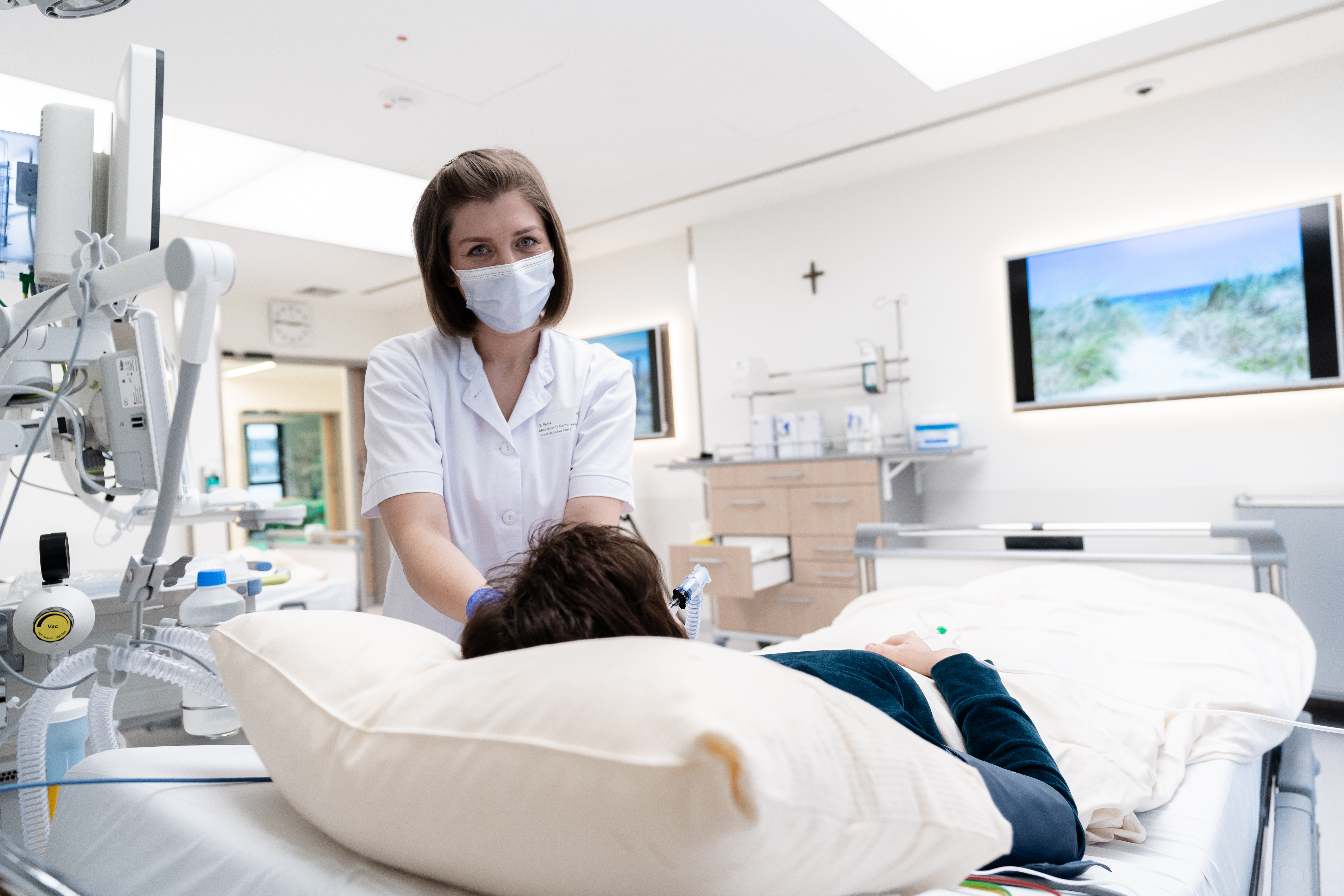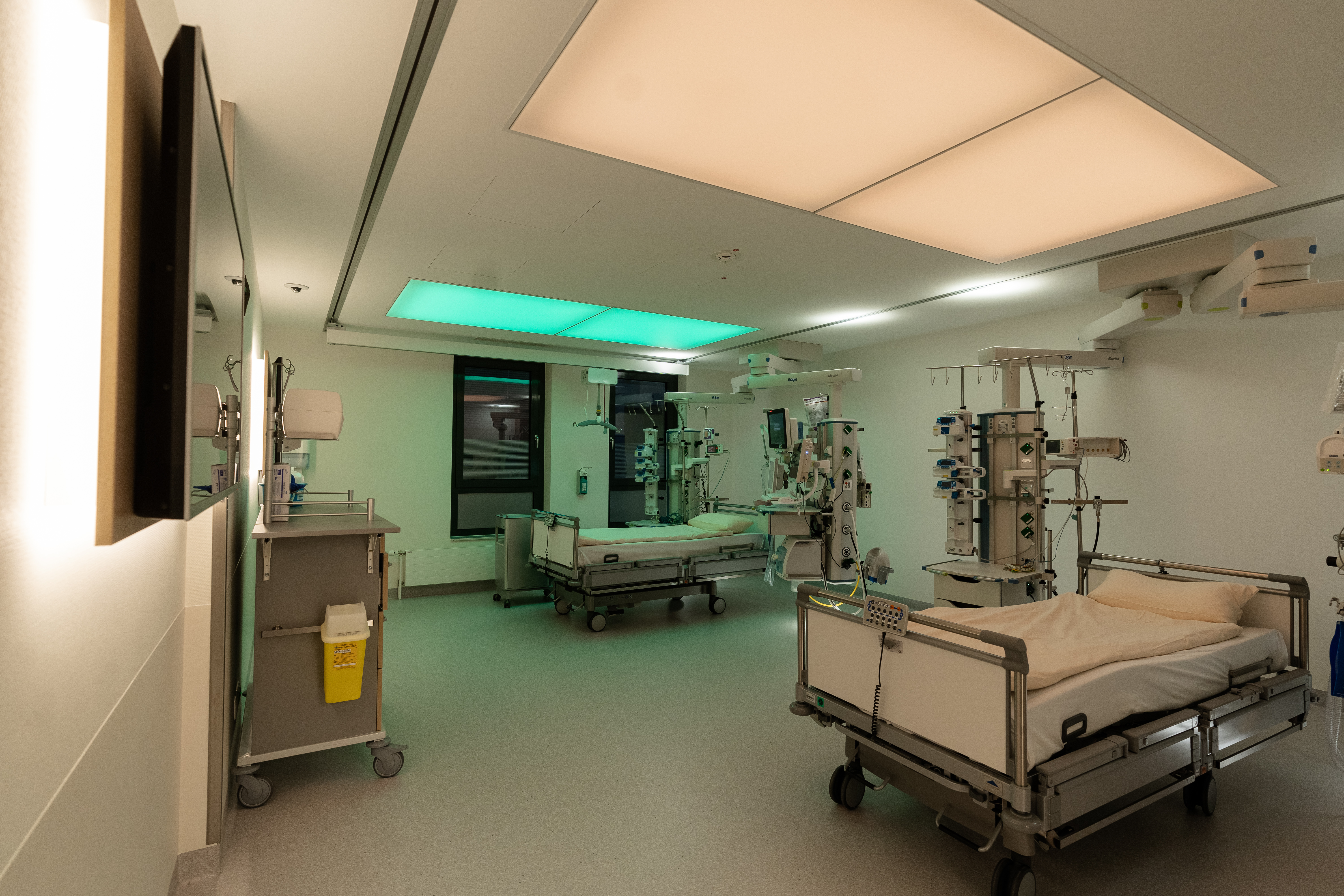 Mit der Gestaltung der neuen Intensivstation mit sieben Zweitbettzimmern im dritten Obergeschoss beschäftigte sich eine spezielle berufsübergreifende Projektgruppe. Unter den Fragestellungen „Wie sieht die Intensivmedizin der Zukunft aus?“ und „Welche Einflussfaktoren und Trends aus Medizin, Gesellschaft, Technik, Digitalisierung und Organisation müssen berücksichtigt werden?“ ist es dem Team gelungen, gemeinsam erarbeitete Maßstäbe zum Wohle der Patientinnen und Patienten bautechnisch umzusetzen.