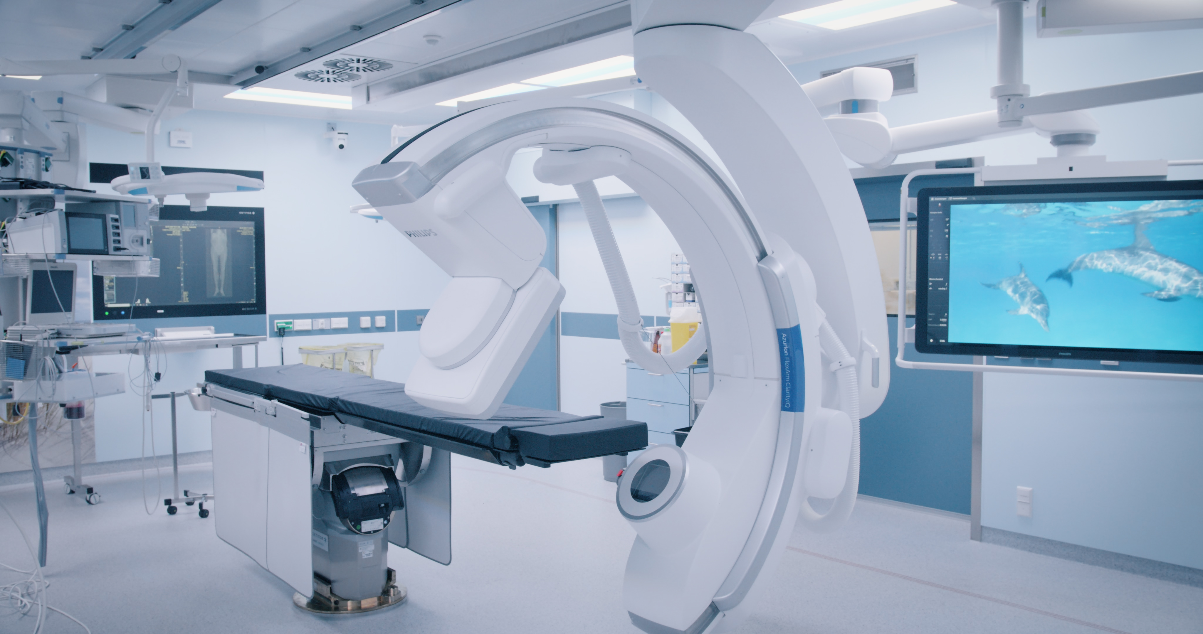 Eine Etage über dem Augen-OP befindet sich der neue Zentral-OP. In einem der vier Säle wurde auf 85 Quadratmetern ein komplett neuer gefäßchirurgischer Hybrid-OP mit einer state-of-the-art Angiographieanlage untergebracht, die in punkto Bildqualität, Beweglichkeit und Leistungsfähigkeit bei reduzierter Strahlenbelastung ihresgleichen sucht.